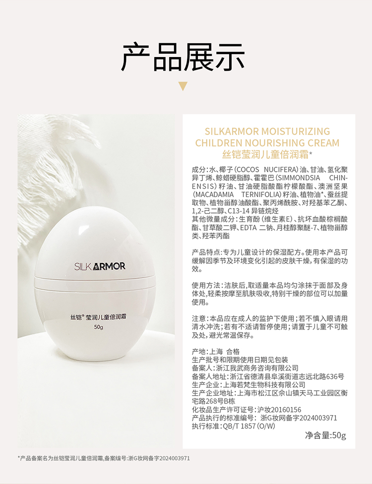 【備案編號】:浙G妝網(wǎng)備字2024003971 【產(chǎn)品功效】:專為兒童設計的保濕配方。使用本產(chǎn)品可緩解因季節(jié)及環(huán)境變化引起的皮膚干燥,有保濕的功效。 【使用方法】:潔膚后,取適量本品均勻涂抹于面部及身體處,輕柔按摩至肌膚吸收,特別干燥的部位可以加量使用。 【適合人群】:兒童 【產(chǎn)品有效期】:3年