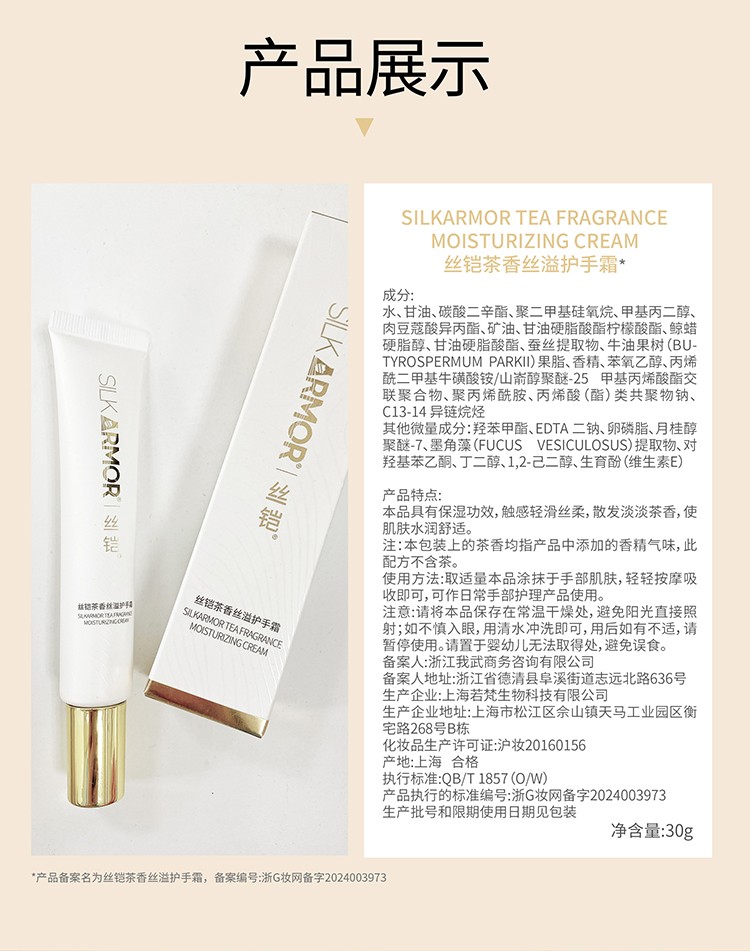 【使用方法】:取適量本品涂抹于手部肌膚,輕輕按摩吸收即可,可作日常手部護理產(chǎn)品使用。
